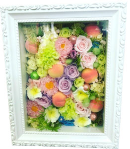 プリザーブドフラワーやアーティフィシャルフラワーを中心にフレームアレンジメントをした商品です。